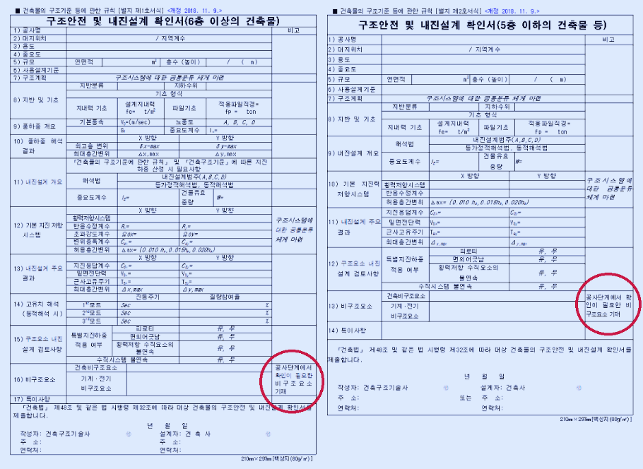 다만 해당 건축물의 비구조요소가 내진대상인지 해당여부만 「구조안전 및 내진설계 확인서」에 기재하도록 되어 있습니다.