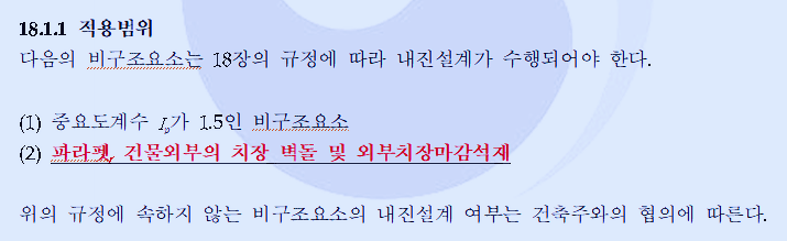 그러나 금번 제정된 KDS 41 17 「건축물 내진설계기준」에서는 내진설계 대상이 되는 건축물에 설치·부착되는 파라펫, 외부치장벽돌, 외부치장마감석재 그리고 피난경로상의 중량칸막이벽 등은 내진이 적용되어야 합니다.