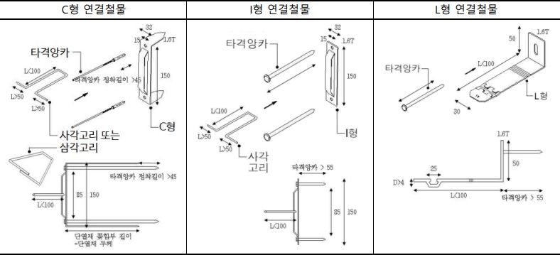 종래에는 일반적으로 0.6m×0.6m 간격마다 설치했었는데, 사양설계 대로라면 C형 또는 I형 연결철물은 최대 0.3m×0.6m이내 간격마다, 주름이 있는 L형 연결철물에 직경 4.8mm이상 철선으로 줄눈보강을 하면 최대 0.55m×0.6m이내 간격마다 설치해야합니다.