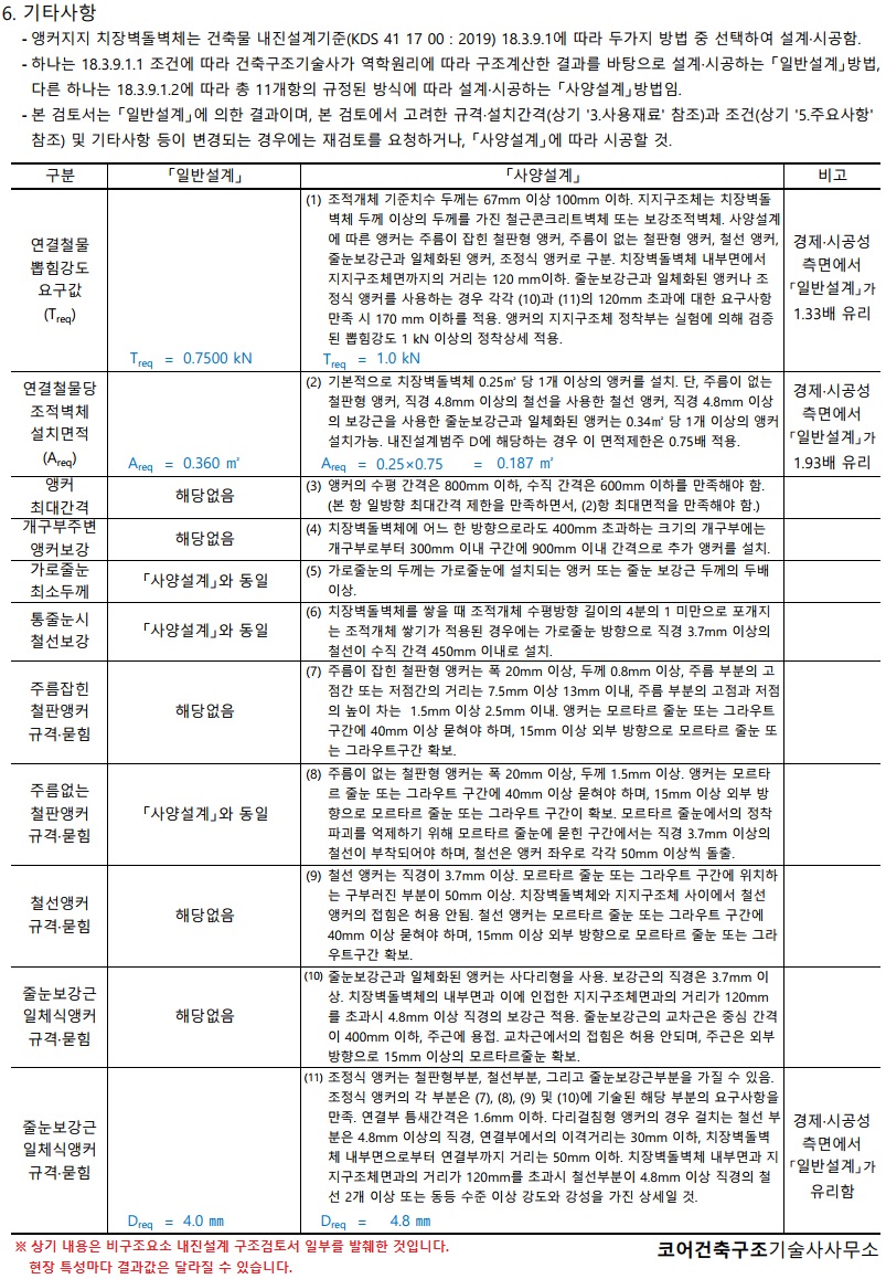 「사양설계」는 엄격한 11개 의무시공조항들의 조건대로 시공하는 것으로 건축구조기술사의 검토를 생략할 수 있습니다.