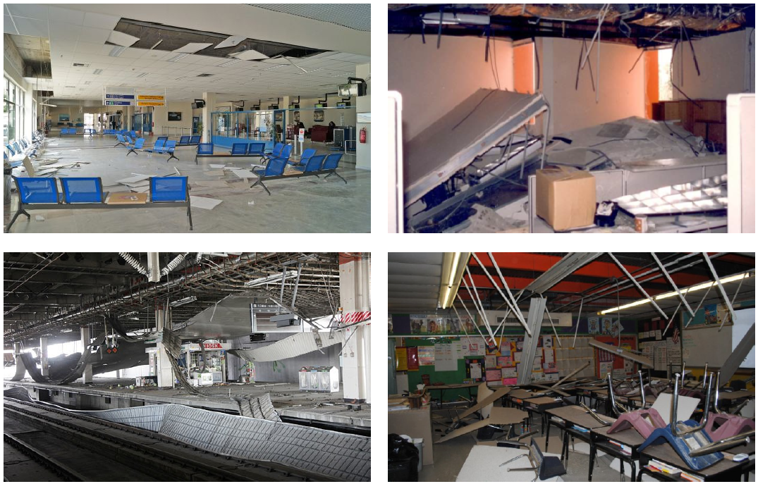 매달린 천장은 천장마감재(텍스 또는 박판금속재 등)를 M-BAR 또는 T-BAR형식으로 고정하는 비구조요소이며, 지진이 발생하거나 발생한 이후에도 기능수행이 유지되어야 하는 내진특등급 즉, 건물중요도'특'인 건축물의 경우 내진안전성 확인 의무대상이고, 중요도가 높지 않은 건물이더라도 건축주(발주처)가 요구하는 경우 검토할 수 있다.