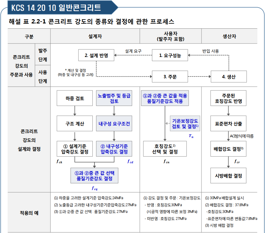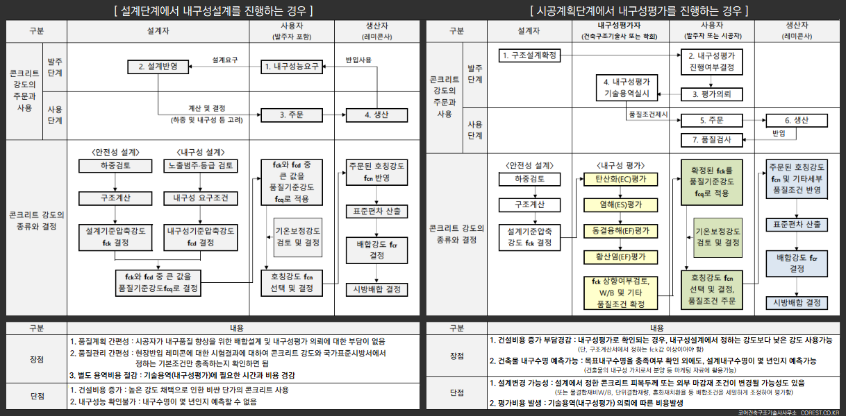 이때 내구성 평가결과에 따라 요구되는 콘크리트압축강도는 안전성(구조계산서)에서 요구하는 콘크리트 설계압축강도 값과 같거나 이보다 다소 높을 수 있습니다.
