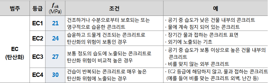 탄산화(노출범주 EC)에서 EC1부터 EC4까지 4개 등급으로 세부적으로 나누고 각각이 요구하는 콘크리트 최소설계압축강도도 과거보다 높아졌습니다.