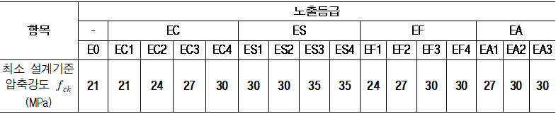 내구성 확보를 위하여 콘크리트 설계기준압축강도는 노출등급에 따라 규정하는 값 이상이라야 합니다. 여기서 규정하는 값은 일반적으로 27MPa 또는 30MPa 이상입니다. 다만, 아래와 같이 기존 구