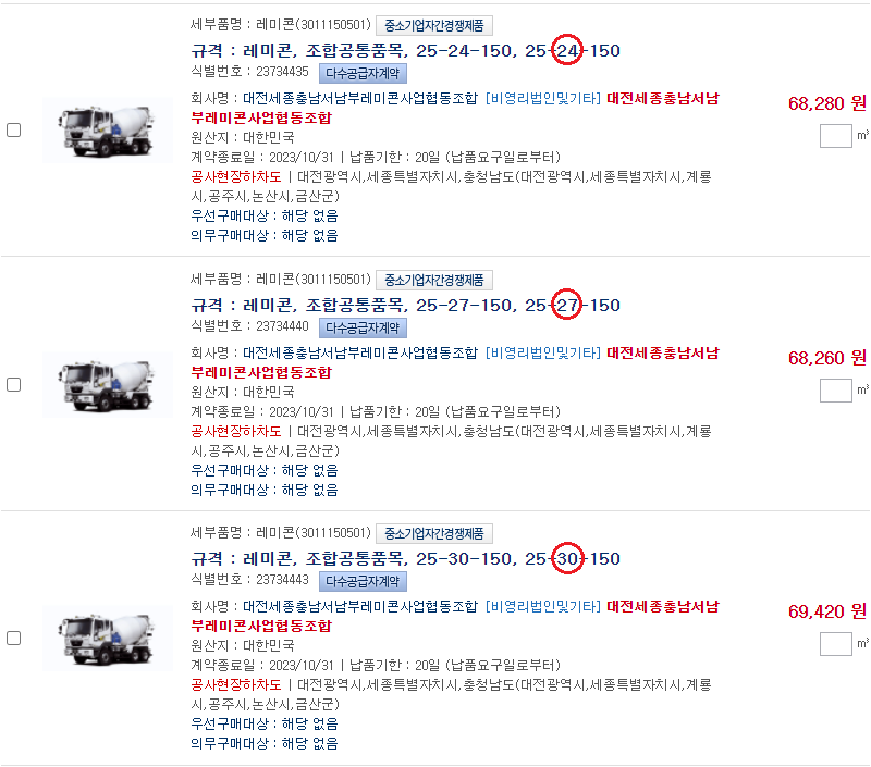 때로는 아래와 같이 27MPa가 24MPa보다 단가가 저렴하거나 동일한 경우도 있습니다.