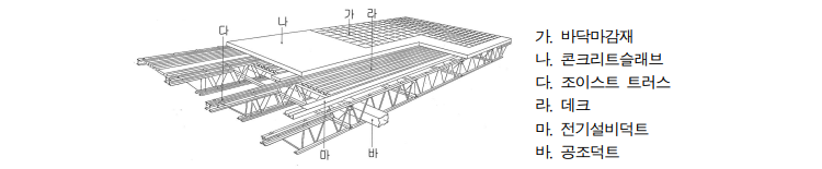 여유있는 천정고를 확보하기 위해서 조이스트 트러스 바닥시스템(Joist Truss Slab)를 적용하였습니다. 이 바닥시스템의 조이스트 트러스는 외부기둥과 내부코어를 연결합니다. 높이 900mm의 조이스트 트러스를 외부기둥 간격에 맞추어 1.02m 간격마다 배치하고 그 위에 거푸집용 메탈데크를 얹고 100mm 두께로 경량콘크리트를 타설하여 슬래브를 형성했습니다. 보를 트러스로 구성함으로써 각종 설비배관들은 트러스 부재들 사이를 지나도록 하여 Dead Space를 최대한으로 없앴습니다.