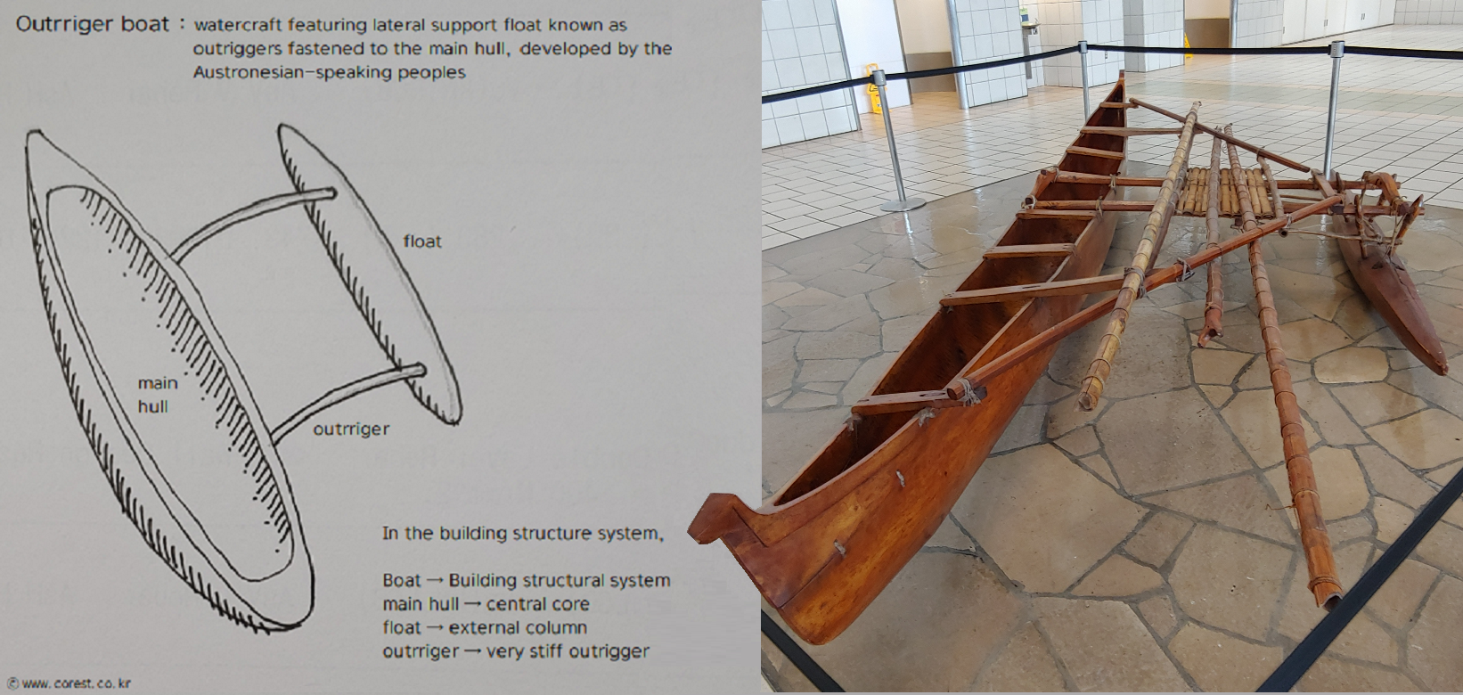 아웃리거는 내부코어와 외부기둥을 강하게 연결하는 부재이며, 남태평양 원주민들이 사용하는 아웃리거보트에서 아이디어를 얻은 것으로 보입니다. 초고층 건물을 사람이 서 있는 것으로 비유하면, 가만히 서 있는 사람을 큰 힘으로 밀치면 넘어지거나 크게 휘청거리겠지만, 땅에 박혀 고정된 지팡이를 양손으로 단단히 붙들고 서있게 된다면 아주 큰 힘으로 밀어도 넘어지지 않고 서있을 수 있는 것처럼, 초고층건물에서도 가장 중요한 내부코어를 사람, 외부기둥을 지팡이, 아웃리거를 팔이라고 한다면 지진이나 태풍으로 발생하는 큰 수평하중에도 건물은 버티고 또 그 흔들림도 적을 것입니다. 초고층건물에서 아웃리거는 사람으로 치면 지팡이를 잡아 뻗은 팔이 튼튼해야하는 것처럼 강성이 상당히 큰 콘크리트 전단벽체나 트러스부재로 구성하고, 수평하중이 작용하면 아웃리거구조시스템에서 외부기둥에 축하중(인장 또는 압축)으로 작용하여 내부코어의 휨거동에 따른 부담을 상당히 분담하는 역할을 합니다.
