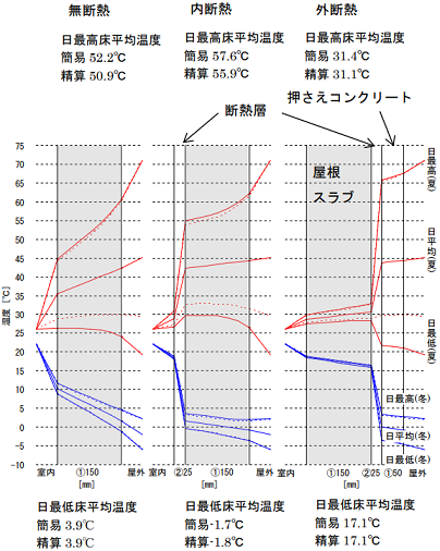 일본건축학회(AIJ)에서 2010년 발간한 온도하중설계자료집(温度荷重設計資料集)에서는 아래와 같이 단열재가 없는 경우, 내단열인 경우, 외단열인 경우에 대한 실험결과를 담았습니다.