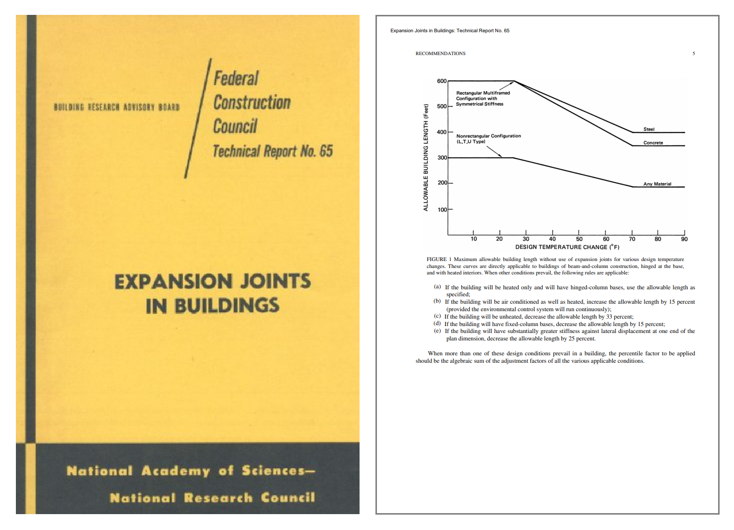 미국 NATIONAL ACADEMY OF SCIENCES에서 1974년 발간한 EXPANSION JOINTS IN BUILDINGS : Technical Report No.65에서 온도변화별 신축이음 사용이 필요없는 최대허용 건물길이( Maximum allowable building length without use of expansion joints)가 제시되어 있습니다. 이를 단위환산하여 표로 정리하면 다음과 같습니다.