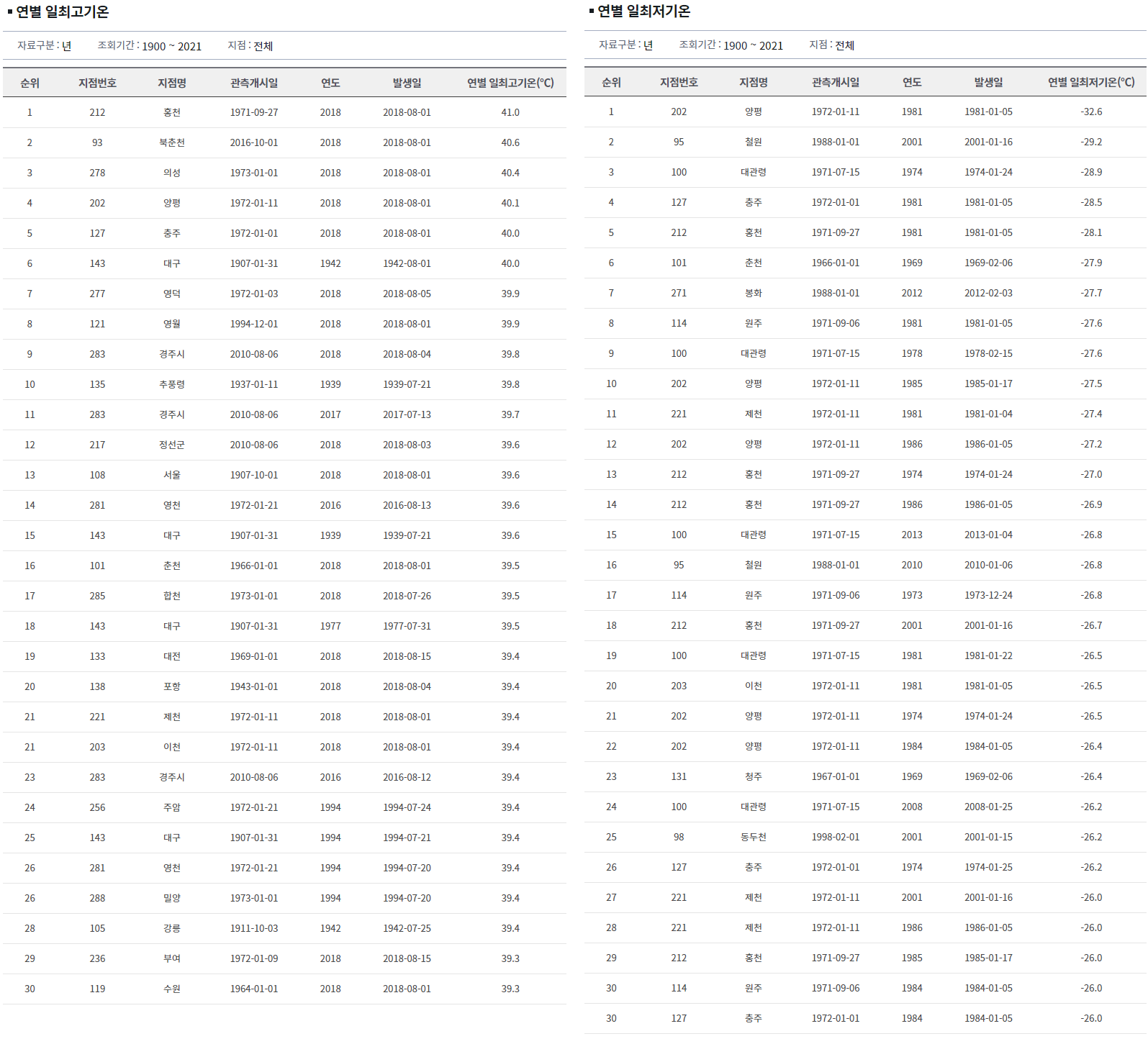 먼저 지역별 일최고기온과 연최저기온을 살펴보면,