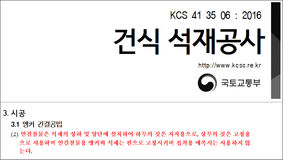 국가건설기준 표준시방서 KCS 41 35 06 「건식 석재공사」 3.1.(2)항에서는 "연결철물은 석재의 상하 및 양단에 설치하여 하부의 것은 지지용으로, 상부의 것은 고정용으로 사용하며 연결철물용 앵커와 석재는 핀으로 고정시키며 접착용 에폭시는 사용하지 않는다"라고 각별하게 금지시키고 있다. 대한민국 내에서 수행되는 건축공사는 관공사등 민간공사든 국가건설기준 표준시방서의 내용을 따라야 한다.