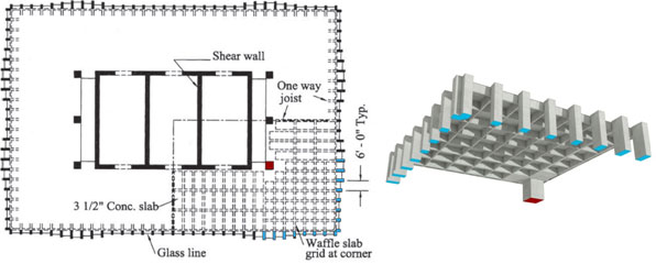 One Shell Plaza가 앞선 사례의 DeWitt-Chestnut Apartments 및 Brunswick Building과 다른 조건은 구조재료로 강재가 아닌 콘크리트를 사용해야 한다는 것이었습니다. 허리케인이 잦은 휴스턴의 지역조건 때문에 높은 강도와 강성을 갖는 구조부재가 필요했고, 당시 이 지역은 뉴욕이나 시카고와는 달리 고층건물이 많지 않아서 이를 시공에 참여할 수 있는 고급경력의 시공기술자가 많지 않고 중저층건물이 대부분이어서 건설재료 수급 인프라도 철근콘크리트 재료에 치중되어 있었기 때문에 강구조보다 철근콘크리트구조가 공사비 측면에서 상당히 경제적이었습니다. 고층건물을 철근콘크리트구조로 하는 경우에 장점은 경제성 외에도 기둥과 슬레브를 일체로 타설하게 되어 골조-전단벽 상호작용이 보다 이상적으로 발휘될 수 있다는 것이고, 단점은 고정하중이 크게 증가하며 저층부에서 요구되는 기둥 크기가 커지고 코어와 외부기둥 사이의 스팬에도 한계가 있다는 것입니다. One Shell Plaza에서는 이러한 단점을 해소하기 위해서 철근콘크리트구조에 사용하는 콘크리트를 보통콘크리트(비중 2.3)가 아닌 경량콘크리트(비중 1.7)로 사용하여 전체 구조물의 자중을 줄였고, 저층부 기둥들 중 축하중을 많이 받는 일부 기둥의 깊이를 0.6m에서 1.2m까지 변화를 주어 건물 외측으로 돌출시킴으로서 외장 미적인 측면에서 익숙하진 않지만 주목성을 높였으며, 각층 슬래브는 와플형으로 계획하여 슬래브 부재자중을 감소시켜 넉넉한 스팬을 확보하였습니다.
