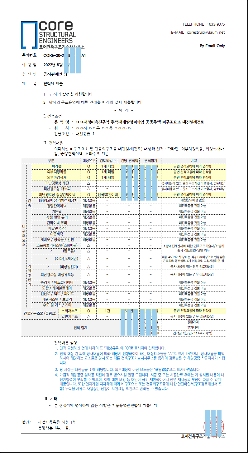 2. 견적 대상 건 외에 공사내용에 따라 해당시 진행하여야 하는 대상요소들을 "△"로 표시 하였으니, 공사내용을 파악하시어 해당하는 요소들은 당사 또는 다른 건축구조기술사사무소를 통하여 검토받은 후 해당공종 착공하시기 바랍니다.