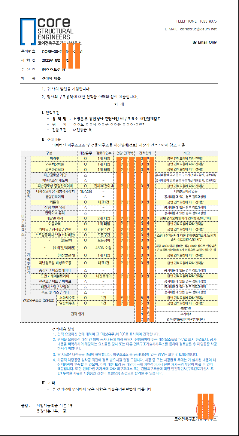 2. 견적 대상 건 외에 공사내용에 따라 해당시 진행하여야 하는 대상요소들을 "△"로 표시 하였으니, 공사내용을 파악하시어 해당하는 요소들은 당사 또는 다른 건축구조기술사사무소를 통하여 검토받은 후 해당공종 착공하시기 바랍니다.