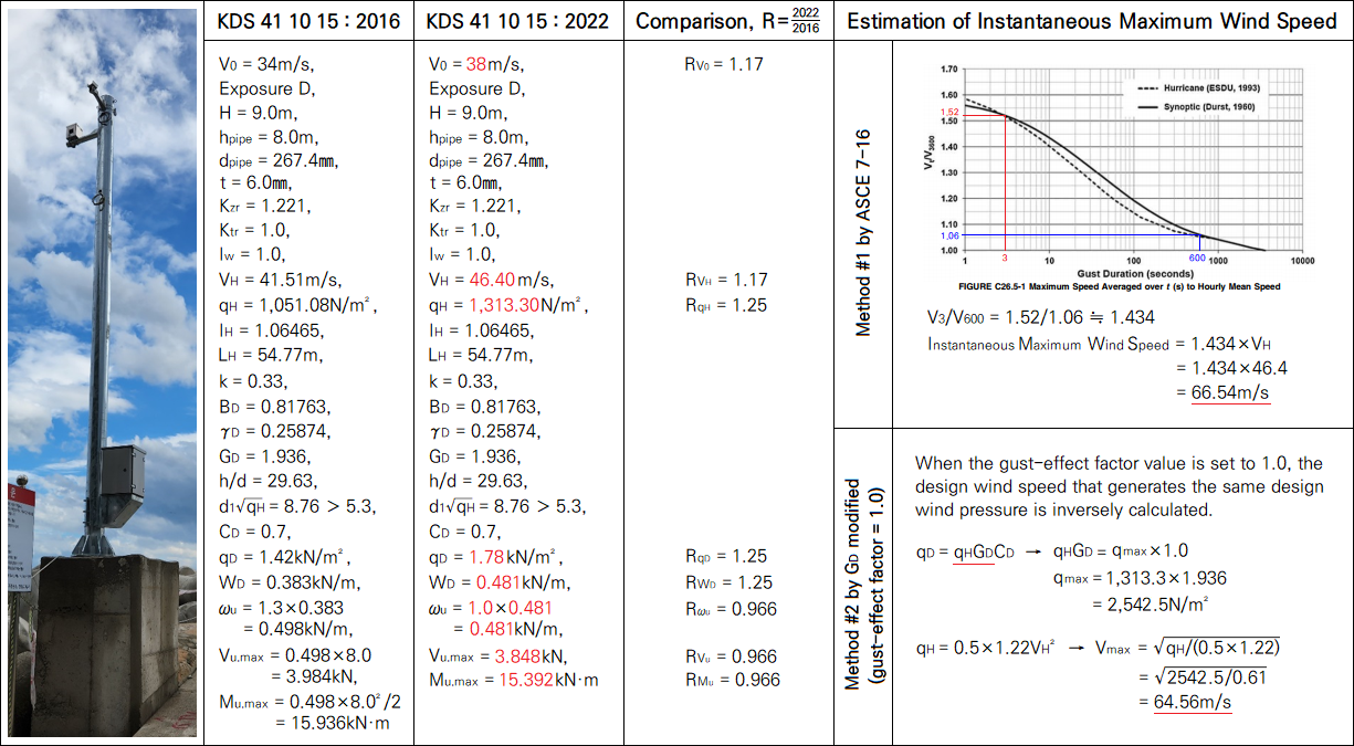 아래는 해안가 관측CCTV 지지구조물로서 기타구조물로서 계산방식이 비교적 단순한 사례를 기준 개정전·후의 비교예시를 통하여 풍하중효과를 살펴 본 것입니다.