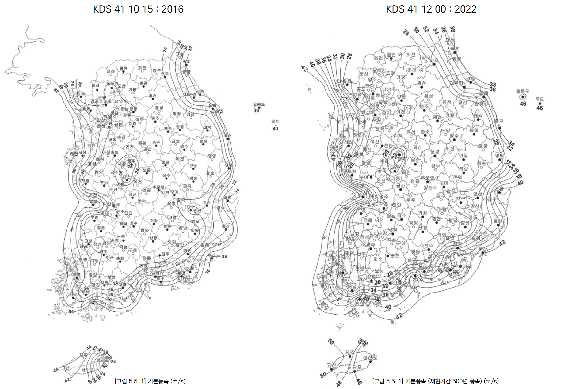 위 기본풍속(재현기간 500년 풍속)의 등풍속지도는 2022년 중 개정 시행될 예정입니다.