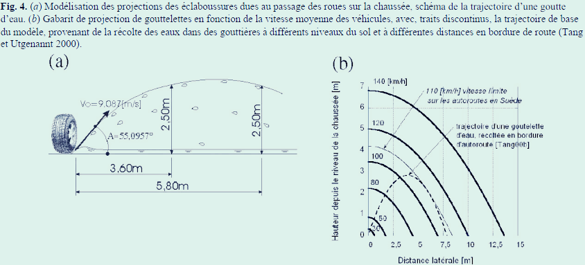 A 2. 수평방향 10m, 수직방향 5m이라는 범위가 어디에서 근거한 내용인지 살펴본다. 해설서 등에서 이 내용에 대한 상세한 근거를 제시하지 않고 있으나, 여러 논문·학술지 중에서 가장 확실하게 그 이유를 알 수 있는 것으로 Canadian Journal of Civil Engineering(Volume 36)에 David Conciatori, Eugen Bru¨ hwiler et Andre´-Gilles Dumont이 2009년 11월 4일자에 발표한 「Actions microclimatique et environnementale des ouvrages d’art routiers」(도로구조물에 대한 미세기후 및 환경 영향)를 꼽을 수 있다. 스위스 고속도로에서 기상청과 고속도로관리국 등의 협조로 이루어진 현장실험 측정 및 문헌조사를 바탕으로 한 것이다. 현장실험에서는 시속 110 km/h로 달리는 차량의 바퀴에 의해 비산되는 물보라의 궤적을 조사하고 이를 바탕으로 포물선운동방정식에 대입하였을 때, 제한속도 110 km/h인 고속도로에서 어느정도 과속 가능성을 고려하여 시속 120 km/h로 설정하여 계산하면, 제빙화학제가 포함된 물보라는 수평방향으로 10m, 수직방향으로 5m까지 비산된다는 학술지의 내용을 내구성 기준에서 받아들여 포함시킨 것으로 보여진다.