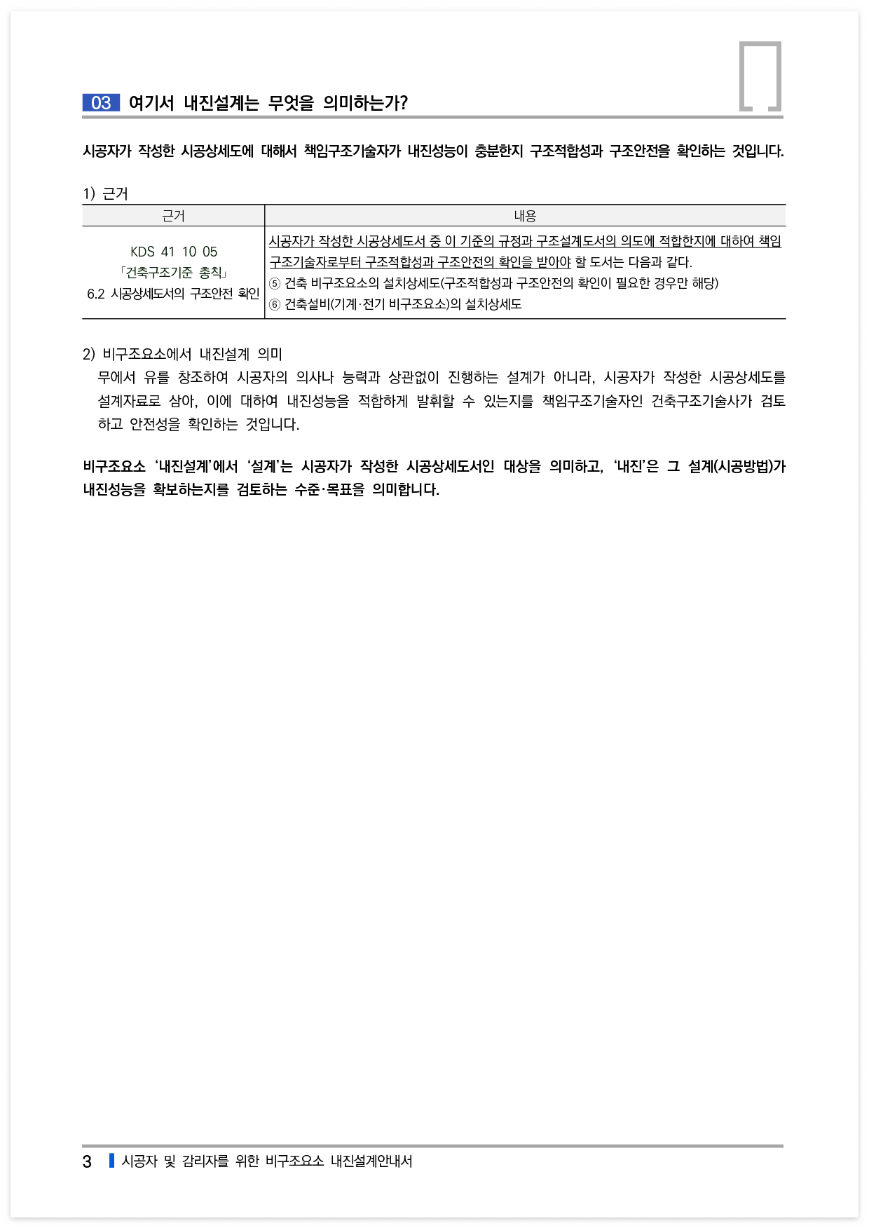 비구조요소 ‘내진설계’에서 ‘설계’는 시공자가 작성한 시공상세도서인 대상을 의미하고, ‘내진’은 그 설계(시공방법)가