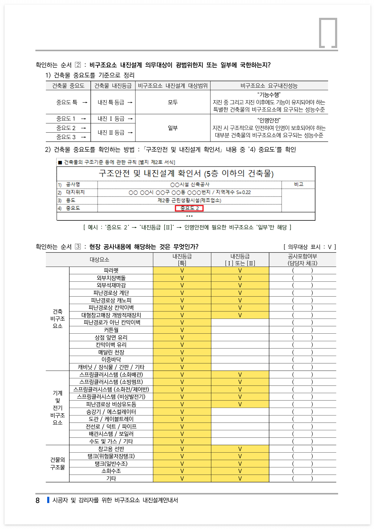 먼저 비구조요소 내진설계를 해야 하는 건축물인지를 파악하고, 비구조요소 내진설계 의무대상이 광범위한지 일부에 국한하는지를 파악하고, 내진설계 의무대상들 중에서 현장 공사내용에 해당하는 것들을 특정하며, 마지막으로 누락된 요소가 없는지 확인하여 정합니다.