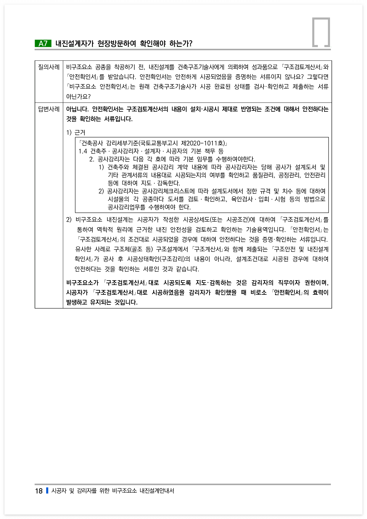 비구조요소를 「구조검토계산서」대로 시공하는 것은 시공자의 책임이고, 이를 지도·감독하는 것은 감리자의 권한이며, 시공자가 「구조검토계산서」대로 시공하였음을 감리자가 확인했을 때 비로소 「안전확인서」의 효력이 발생하고 유지되는 것입니다.