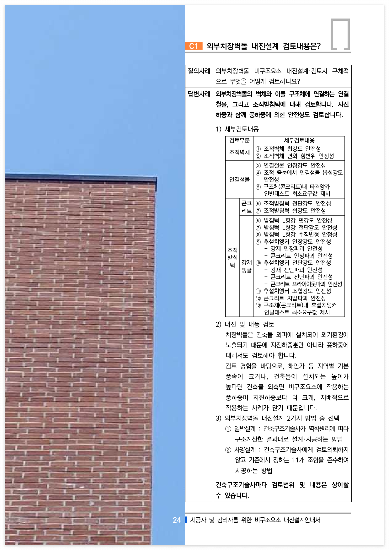 외부치장벽돌의 벽체와 이를 구조체에 연결하는 연결철물, 그리고 조적받침턱에 대해 검토합니다. 지진하중과 함께 풍하중에 의한 안전성도 검토합니다.