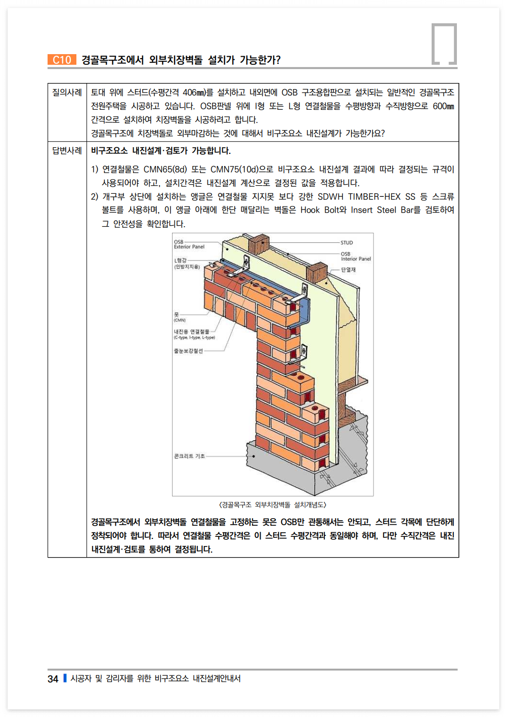경골목구조에서 외부치장벽돌 연결철물을 고정하는 못은 OSB에만 관통해서는 안되고, 스터드 각목에 단단하게 정착되어야 합니다. 따라서 연결철물 수평간격은 이 스터드 수평간격과 동일해야 하며, 다만 수직간격은 내진설계·검토를 통하여 결정됩니다.