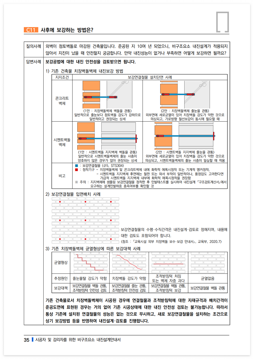 기존 건축물로서 치장벽돌벽체이 시공된 경우에 연결철물과 조적받침턱에 대한 자재규격과 배치간격이 준공도면에 표현된 경우는 거의 없어 기존 시공상태에 대한 내진 안전성 검토는 불가능합니다. 따라서 통상 기존에 설치된 연결철물의 성능은 없는 것으로 무시하고, 새로 보강연결철물을 설치하는 조건으로 상기 보강방법 등을 반영하여 내진설계·검토를 진행합니다.