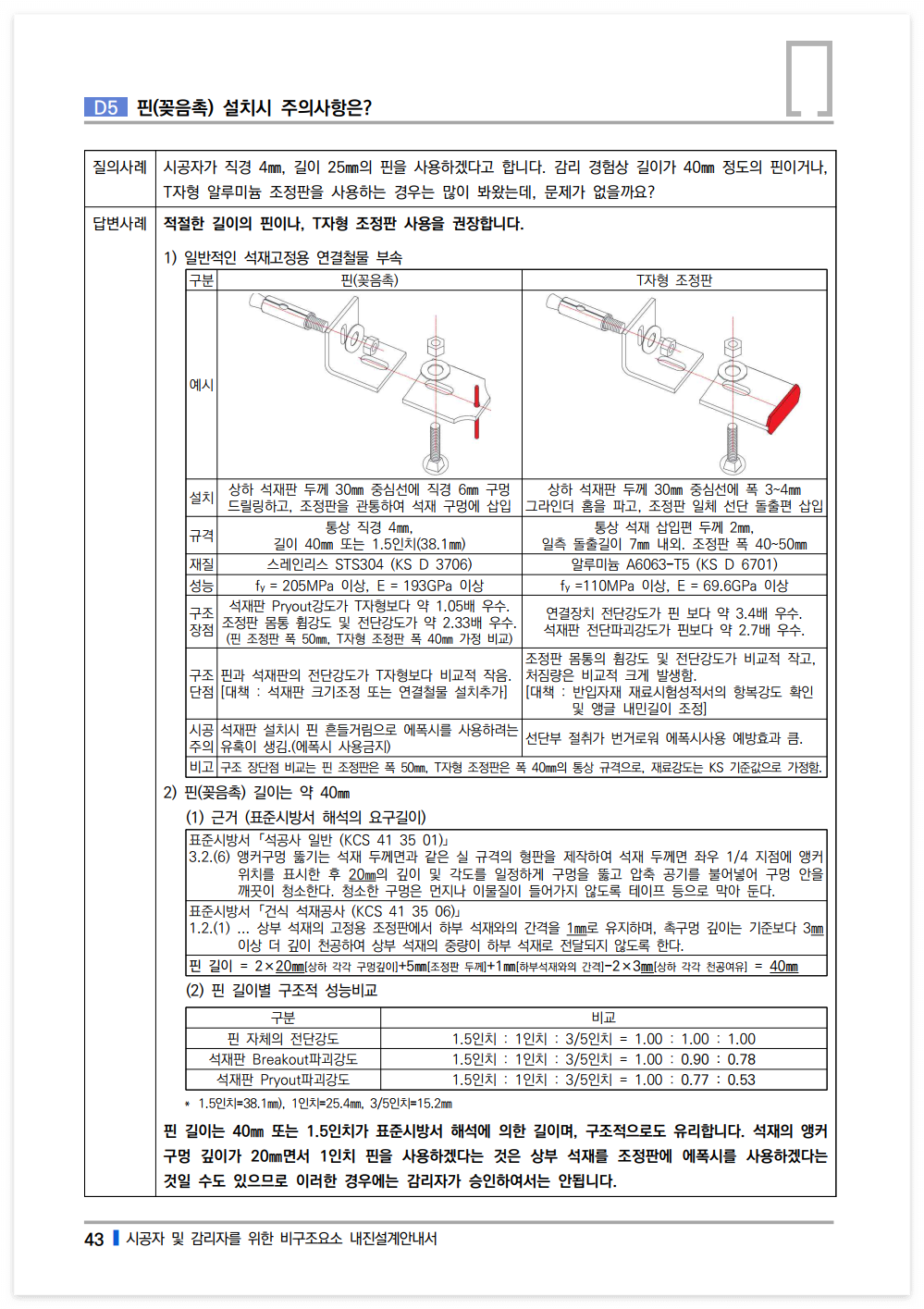 핀 길이는 40㎜ 또는 1.5인치가 표준시방서 해석에 의한 길이며, 구조적으로도 유리합니다. 석재의 앵커구멍 깊이가 20㎜면서 1인치 핀을 사용하겠다는 것은 상부 석재를 조정판에 에폭시를 사용하겠다는 것일 수도 있으므로 이러한 경우에는 감리자가 승인하여서는 안됩니다.