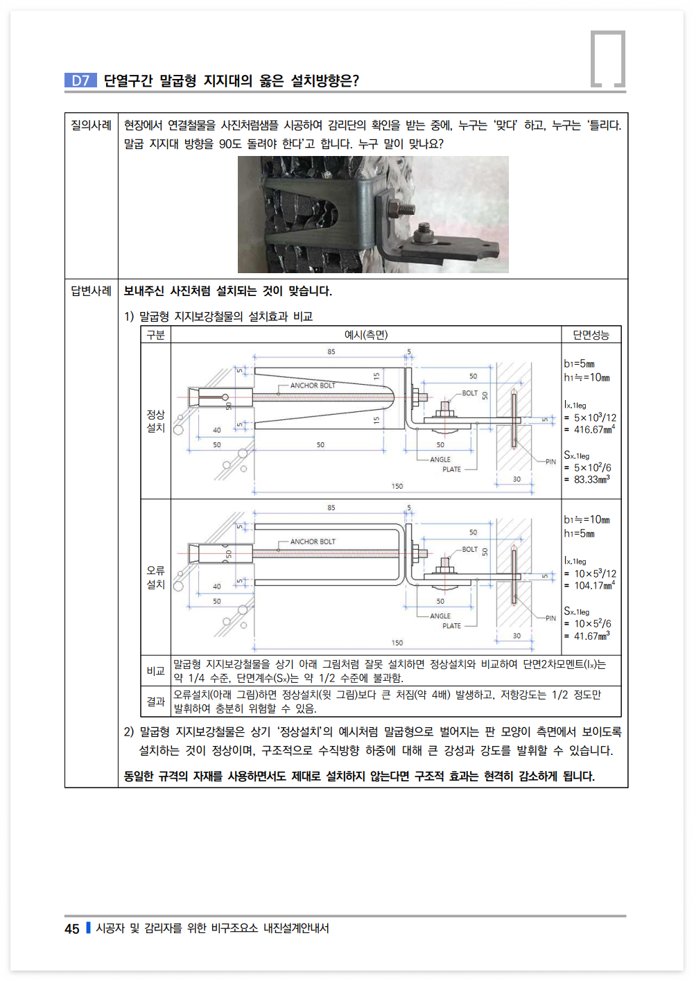 말굽형 지지보강철물은 상기 ‘정상설치’의 예시처럼 말굽형으로 벌어지는 판 모양이 측면에서 보이도록 설치하는 것이 정상이며, 구조적으로 수직방향 하중에 대해 큰 강성과 강도를 발휘할 수 있습니다.