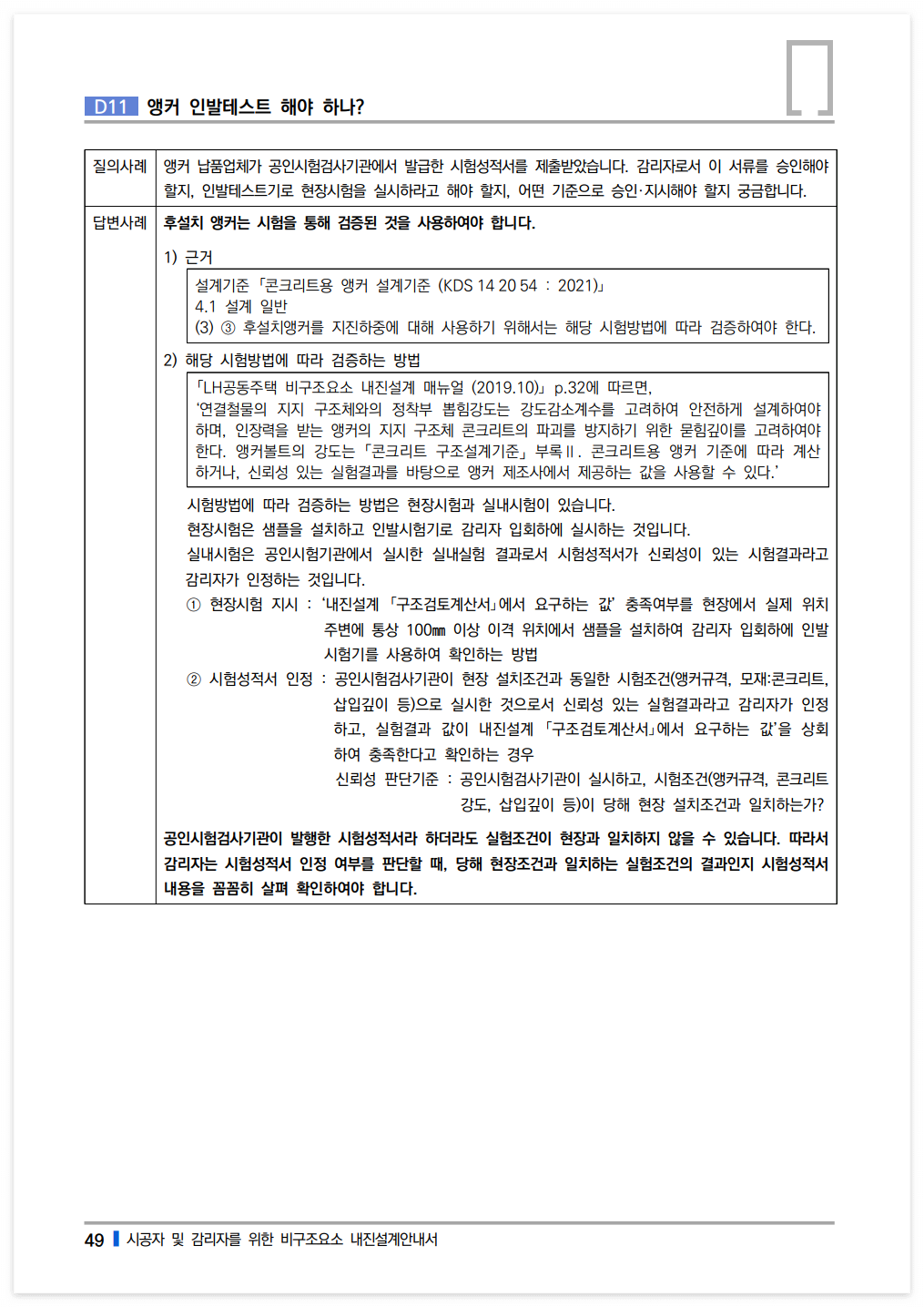 후설치 앵커는 시험을 통해 검증된 것을 사용하여야 합니다.