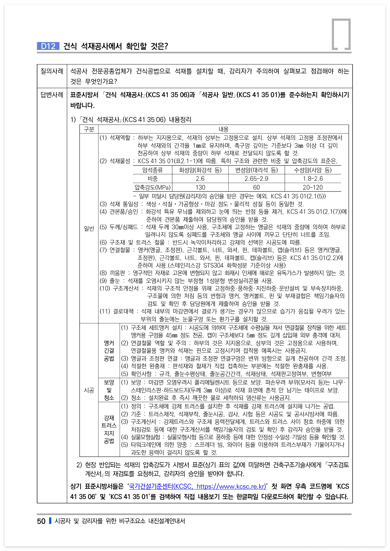 표준시방서 「건식 석재공사」(KCS 41 35 06)과 「석공사 일반」(KCS 41 35 01)를 준수하는지 확인하시기 바랍니다.
