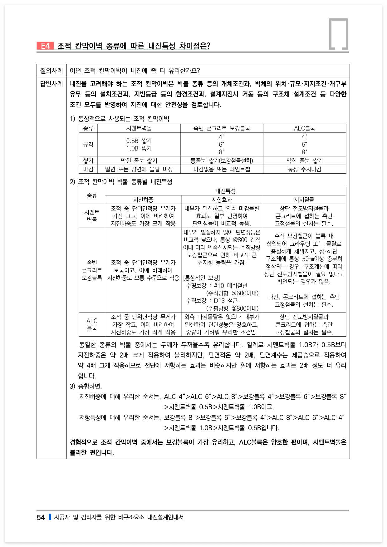 경험적으로 조적 칸막이벽 중에서는 보강블록이 가장 유리하고, ALC블록은 양호한 편이며, 시멘트벽돌은 불리한 편입니다.