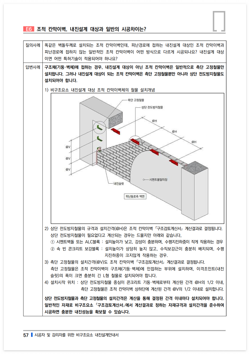 구조체(기둥·벽체)에 접하는 경우, 내진설계 대상이 아닌 조적 칸막이벽은 일반적으로 측단 고정철물만 설치합니다. 그러나 내진설계 대상이 되는 조적 칸막이벽은 측단 고정철물뿐만 아니라 상단 전도방지철물도 설치되어야 합니다.