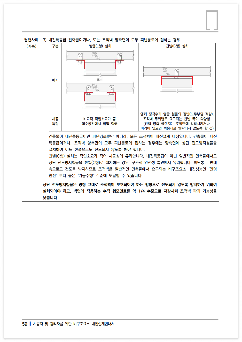 상단 전도방지철물은 수직판 부분이 피난통로측 벽면에 접하도록 설치해야 합니다.