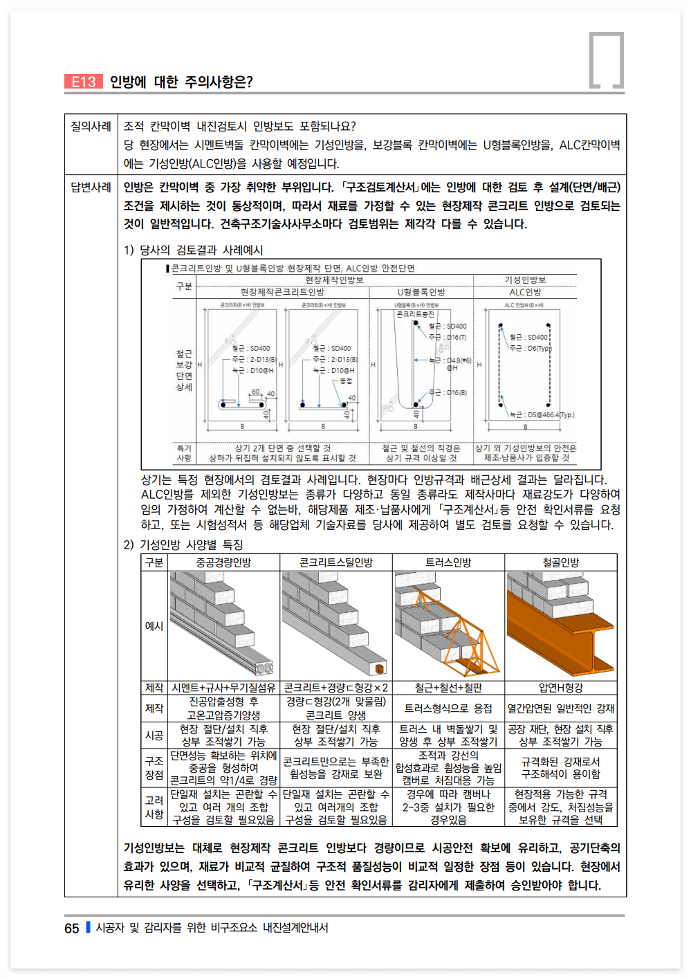 인방은 칸막이벽 중 가장 취약한 부위입니다. 「구조검토계산서」에는 인방에 대한 검토 후 설계(단면/배근)조건을 제시하는 것이 통상적이며, 따라서 재료를 가정할 수 있는 현장제작 콘크리트 인방으로 검토되는 것이 일반적입니다. 건축구조기술사사무소마다 검토범위는 제각각 다를 수 있습니다.