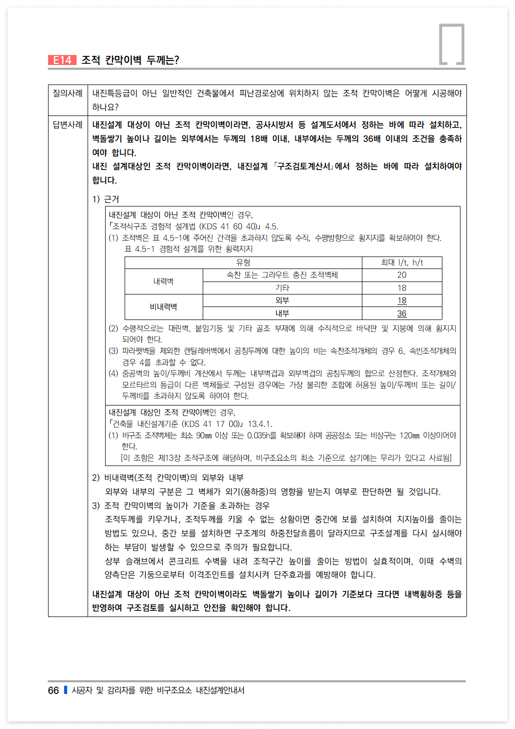 내진설계 대상이 아닌 조적 칸막이벽이라면, 공사시방서 등 설계도서에서 정하는 바에 따라 설치하고, 벽돌쌓기 높이나 길이는 외부에서는 두께의 18배 이내, 내부에서는 두께의 36배 이내의 조건을 충족하여야 합니다.