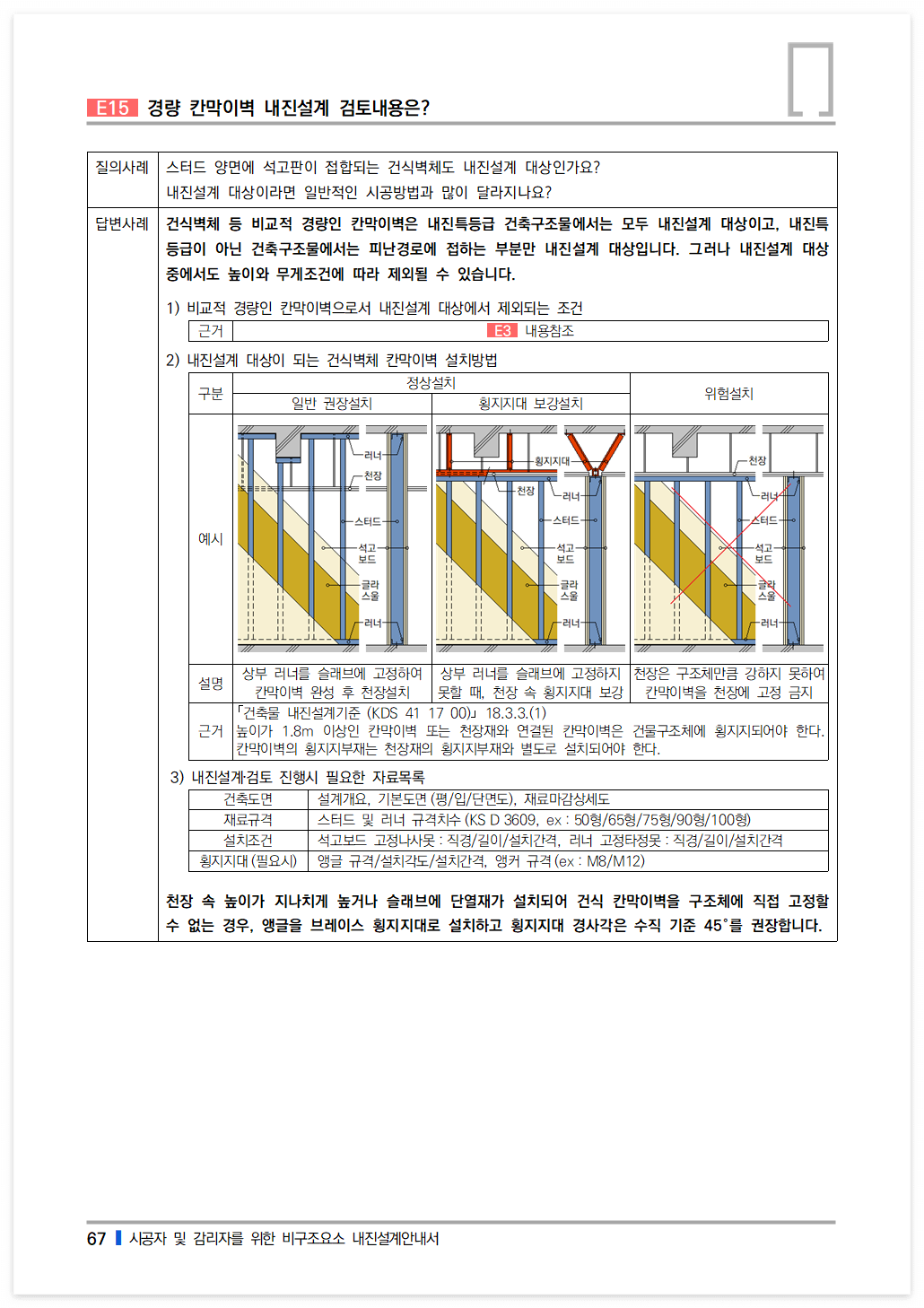 건식벽체 등 비교적 경량인 칸막이벽은 내진특등급 건축구조물에서는 모두 내진설계 대상이고, 내진특등급이 아닌 건축구조물에서는 피난경로에 접하는 부분만 내진설계 대상입니다. 그러나 내진설계 대상 중에서도 높이와 무게조건에 따라 제외될 수 있습니다.