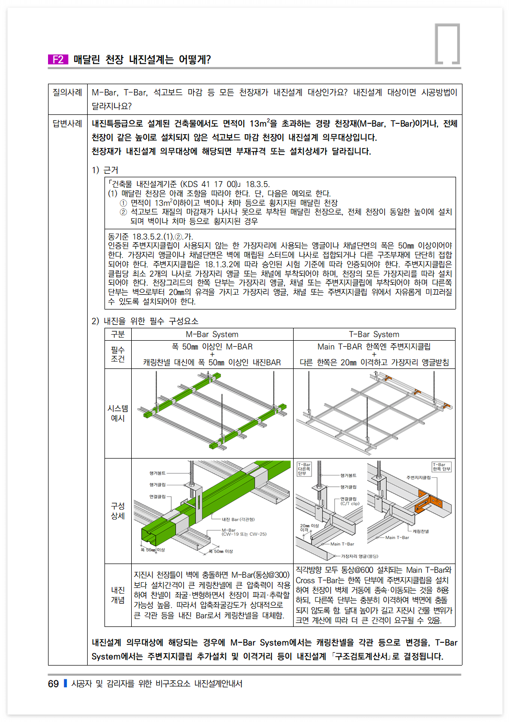 내진설계 의무대상에 해당되는 경우에 M-Bar System에서는 캐링찬넬을 각관 등으로 변경을, T-Bar System에서는 주변지지클립 추가설치 및 이격거리 등이 내진설계 「구조검토계산서」로 결정됩니다.