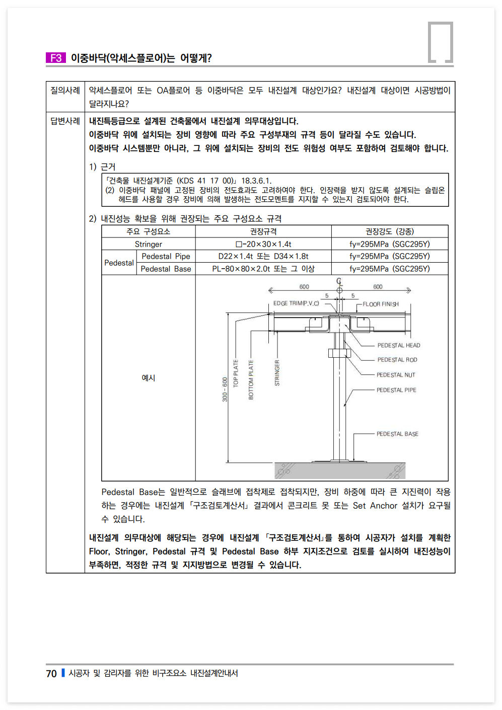 내진설계 의무대상에 해당되는 경우에 내진설계 「구조검토계산서」를 통하여 시공자가 설치를 계획한 Floor, Stringer, Pedestal 규격 및 Pedestal Base 하부 지지조건으로 검토를 실시하여 내진성능이 부족하면, 적정한 규격 및 지지방법으로 변경될 수 있습니다.