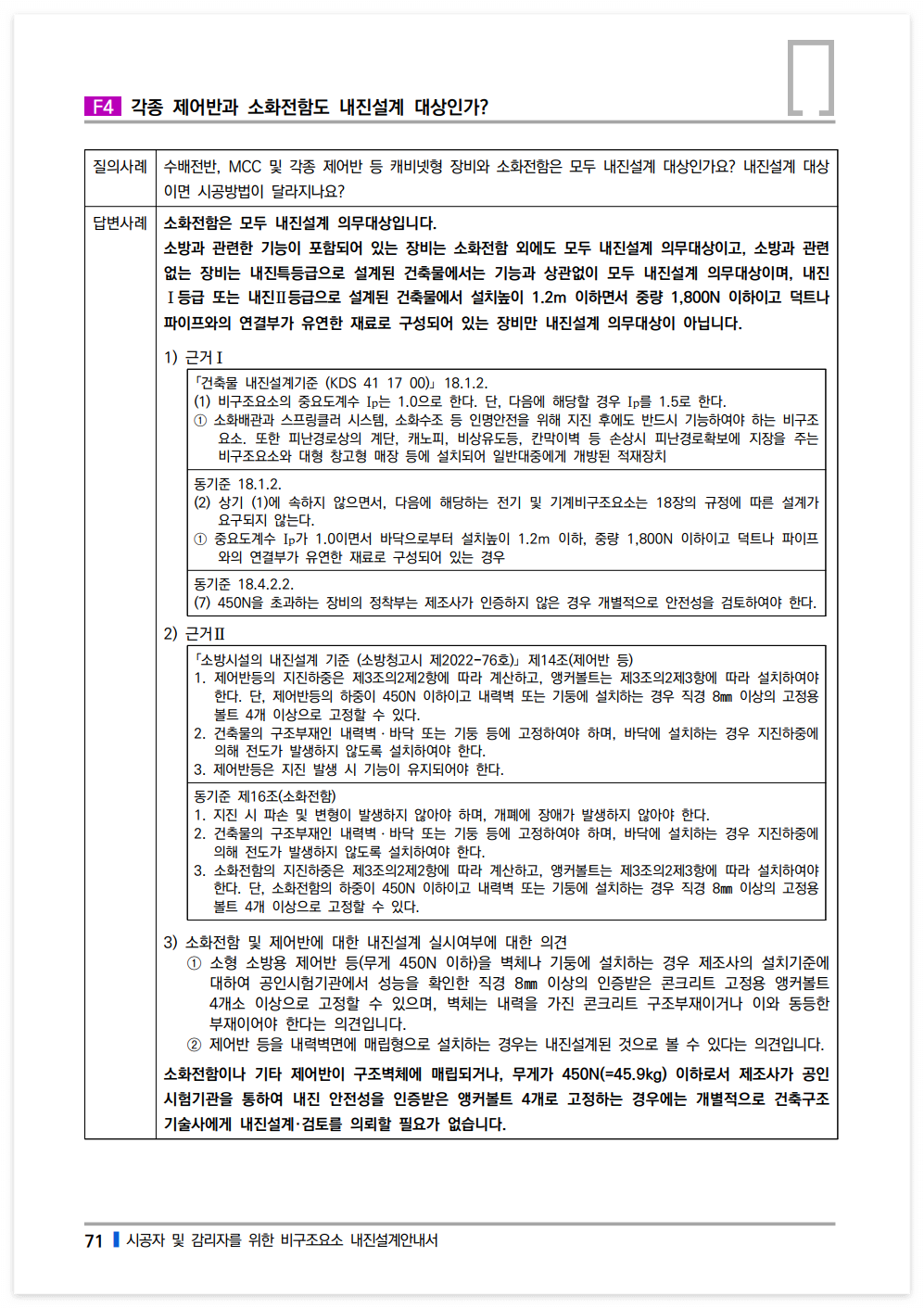 소화전함이나 기타 제어반이 구조벽체에 매립되거나, 무게가 450N(=45.9kg) 이하로서 제조사가 공인시험기관을 통하여 내진 안전성을 인증받은 앵커볼트 4개로 고정하는 경우에는 개별적으로 건축구조기술사에게 내진설계·검토를 의뢰할 필요가 없습니다.
