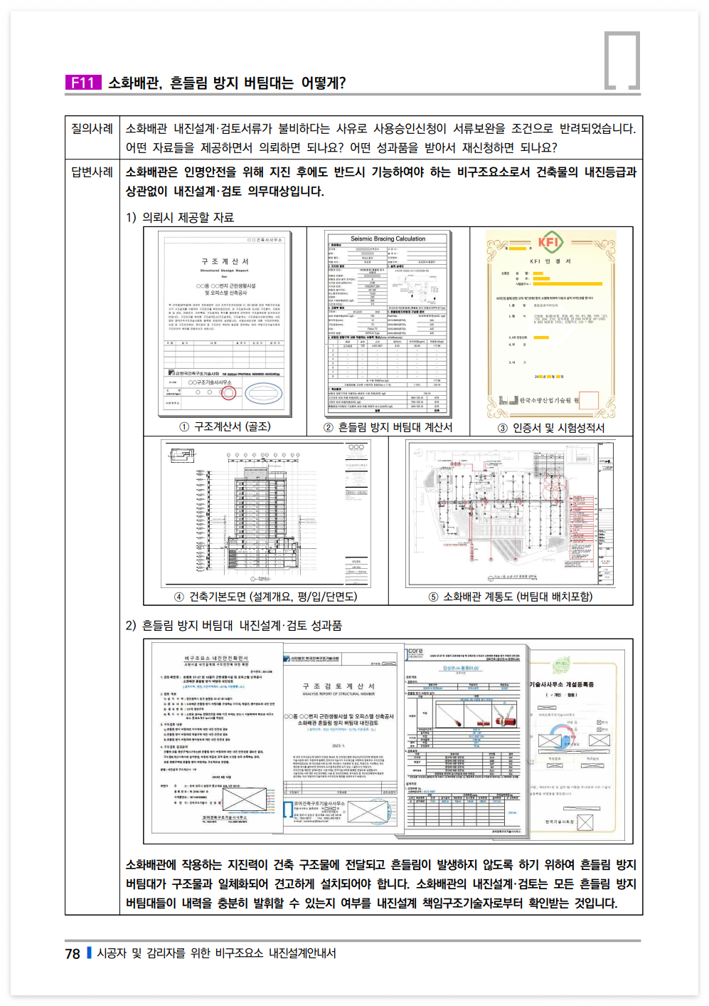 소화배관에 작용하는 지진력이 건축 구조물에 전달되고 흔들림이 발생하지 않도록 하기 위하여 흔들림 방지 버팀대가 구조물과 일체화되어 견고하게 설치되어야 합니다. 소화배관의 내진설계·검토는 모든 흔들림 방지 버팀대들이 내력을 충분히 발휘할 수 있는지 여부를 내진설계 책임구조기술자로부터 확인받는 것입니다.