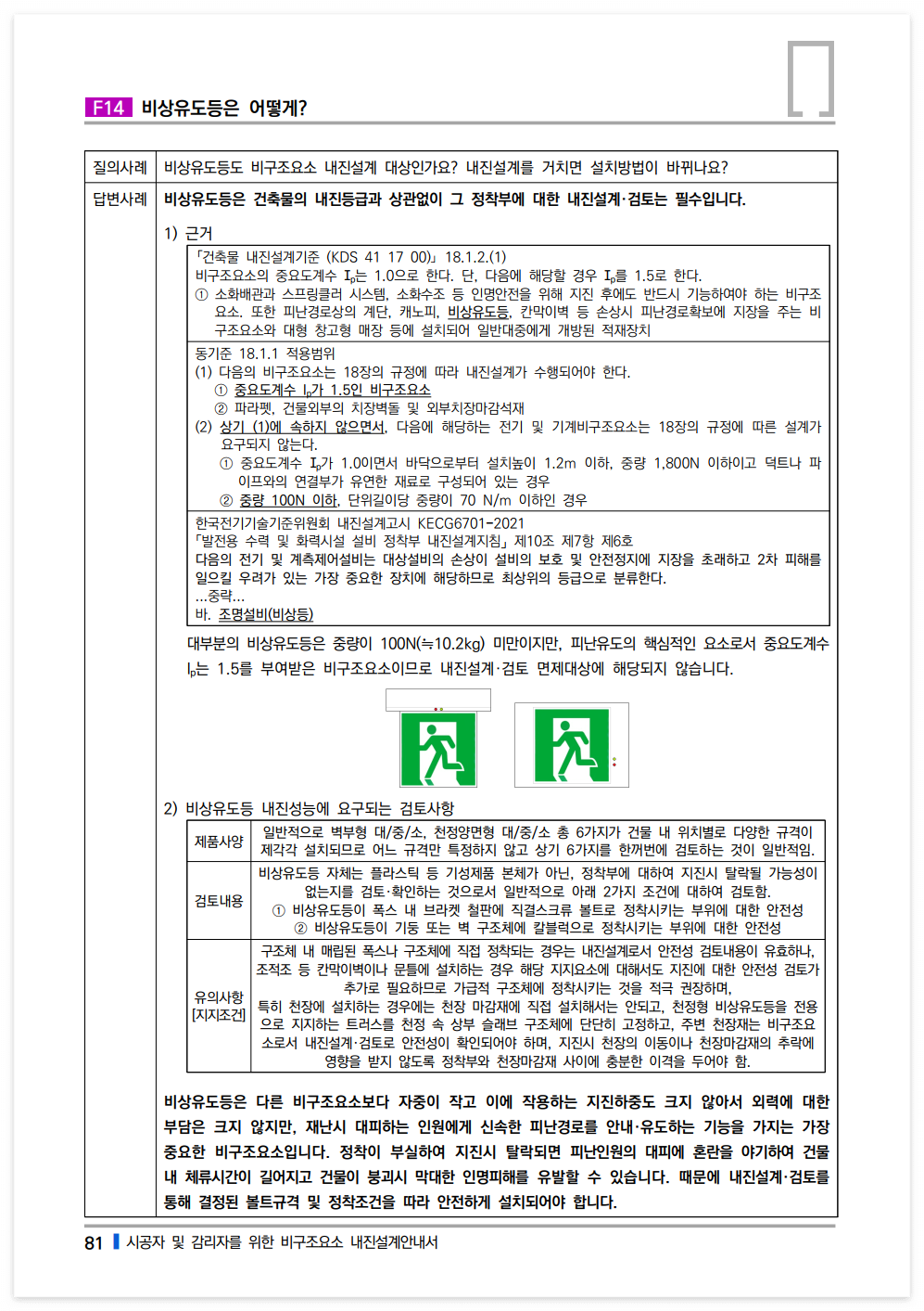 비상유도등은 건축물의 내진등급과 상관없이 그 정착부에 대한 내진설계·검토는 필수입니다.
