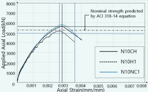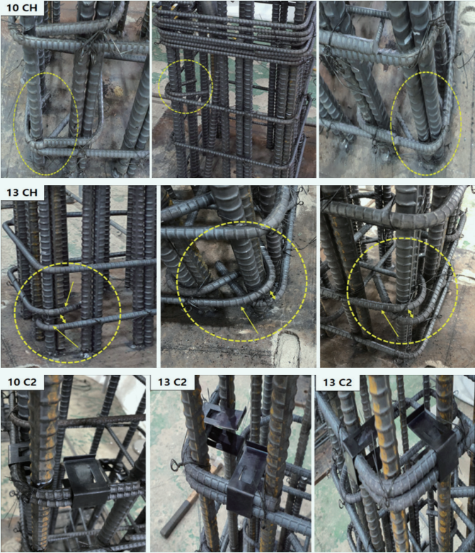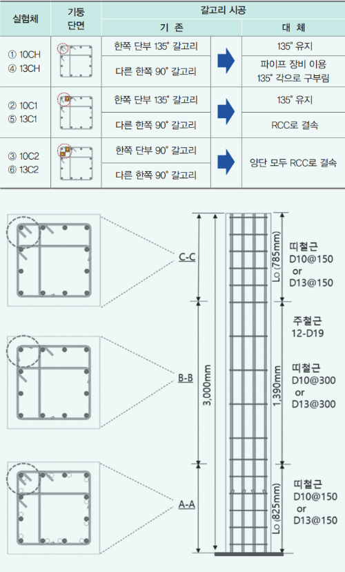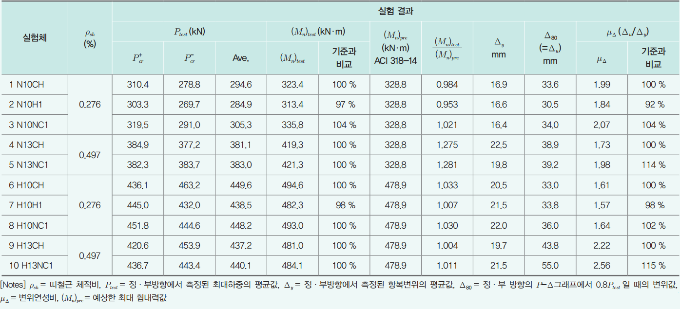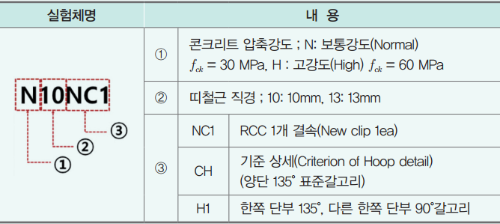 기준을 충족하는 양단 135˚ 표준갈고리(이하 내진갈고리)로 설치된 실험체 "CH"와, 한쪽 단부는 내진갈고리로 다은 한쪽 단부는 90˚ 갈고리로 설치하여 기준에 부적합한 실험체 "H1"과, 이 부적합 실험체 90˚ 갈고리 부분에 RCC를 설치한 대체공법 실험체 "NC1"을 비교했을 때, "CH"를 기준으로 "H1"은 당연히 작은 하중에 파괴되었고, "NC1"은 "CH"과 대등하거나 보다 우수한 구속효과 성능을 가집니다.