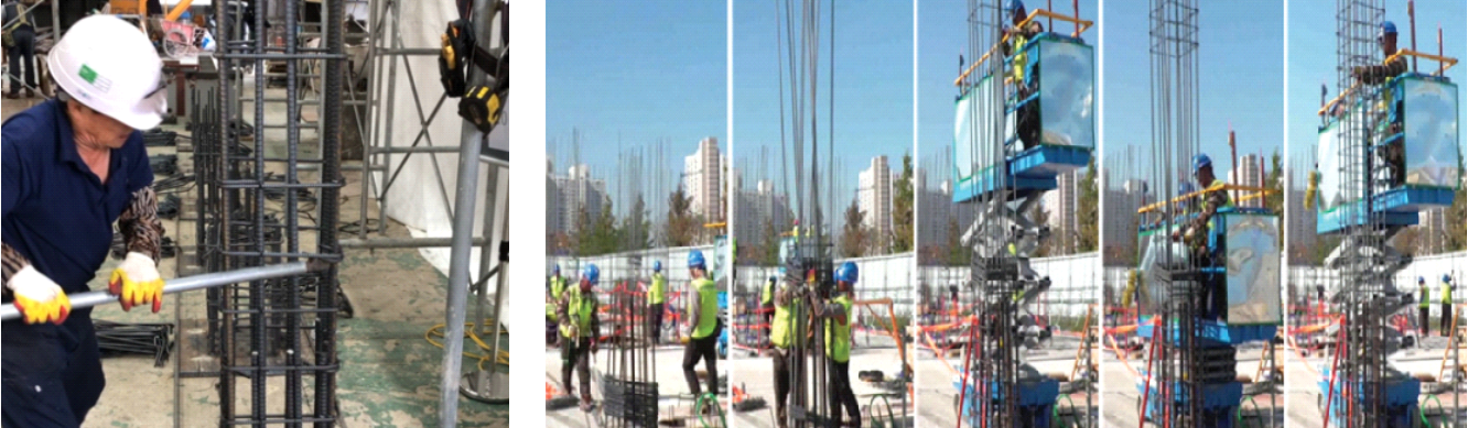 굵은 주근을 힘겹게 밀어내면서 내진갈고리를 장착하거나, 주근 배근 전에 미리 띠철근을 걸어두고 주근들을 벌리면서 정해진 간격으로 긴결시켜야 합니다.