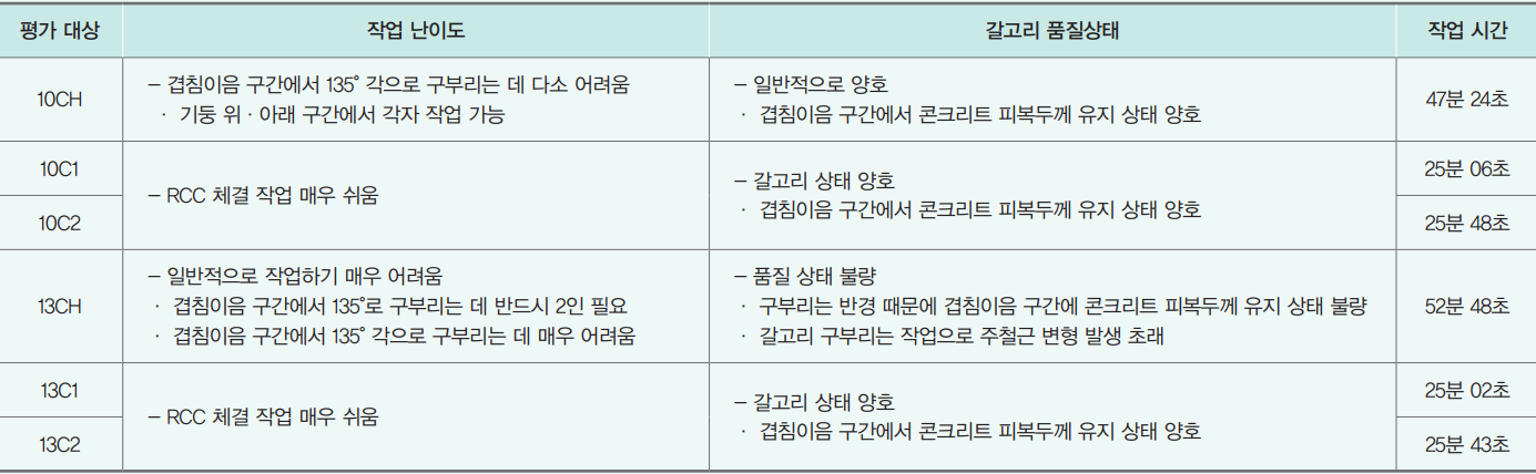 종합적으로 정리하면 CH-RCC는 기준에서 정하는 방식과 비교했을 때 구조적 성능면에서 대등하거나 보다 우수한 구속효과 성능을 가지며, 특히 시공 편이성이 우수하여 경제적으로 17~38% 수준으로 노무비가 절감되는 유리한 효과가 있습니다.