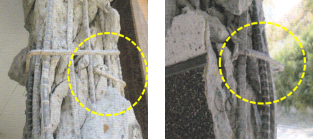 ① 과도한 하중에 의한 부재 변형 ↓ ② 피복 콘크리트 탈락 ↓ ③ 띠철근에 인장력 작용 ↓ ④ 90˚ 갈고리 벌어짐 ↓ ⑤ 띠철근 풀림 ↓ ⑥ 띠철근에 구속받는 주근 좌굴파괴 ↓ ⑦ 심부콘크리트 파괴 ↓ ⑧ 부재 파괴 ↓ ⑨ 건물 붕괴 |