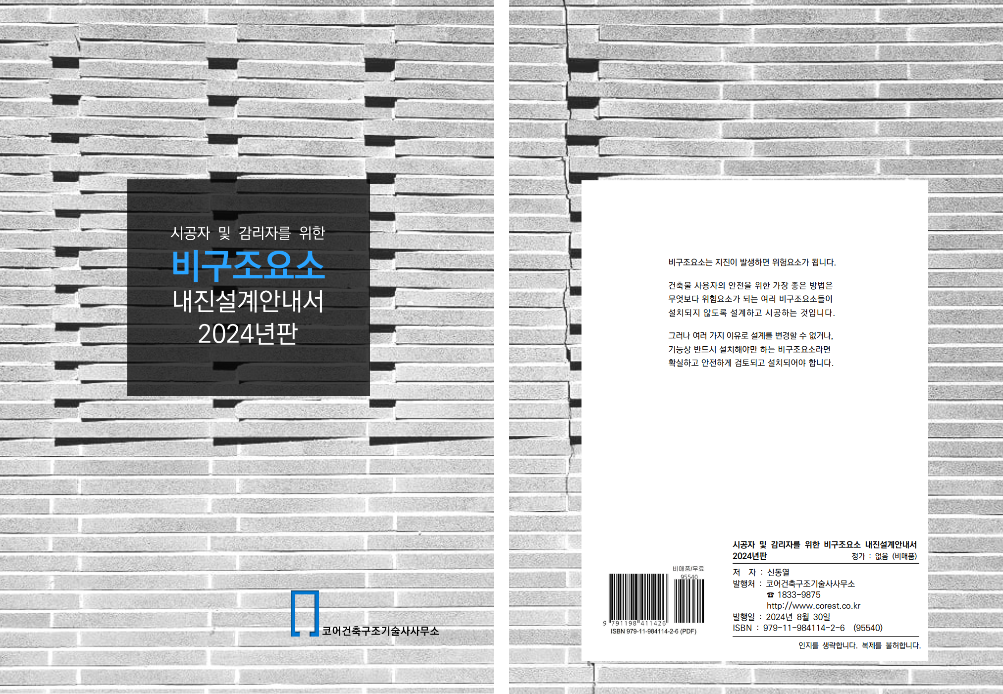 | 이 안내서는 시공자와 감리자가 현장에서 행정적으로 필요한 내용을 담아 이해도를 높이는 것을 주된 목적으로 작성한 것이므로 건축구조기술사가 구조역학적 안전성을 확인하는 과정인 역학적 원리·공식·기법 등에 대해서는 가급적 다루지 않습니다. 이 안내서는 무료로 배포되는 비매품입니다. 개인이라면 누구라도 자유롭게 사용하거나 인터넷 등에 제한 없이 공유할 수 있고, 정부, 지자체, 공공기관 ,학교 및 회사 등에서 교육용으로 사용하고 공유할 수 있습니다. 다만 회사가 영업을 위한 홍보자료로 사용하기 위하여 일부 내용만 인용하거나 일부 그림을 사용하는 것은 거부합니다. 그리고 이 책자의 내용을 전부 또는 일부를 편집 또는 가공하여 금전적 이익을 취하는 것도 거부합니다. 이 안내서는 비구조요소 내진설계·검토의 기술용역 업무를 수행한 코어건축구조기술사사무소가 업무 및 상담 경험을 토대로 작성하였습니다. 법령 및 기준 등 객관적인 근거를 기재함을 원칙으로 하되, 배경이나 취지, 판단 등에 근거가 기재되지 않은 것은 경험적 의견으로 보시기 바랍니다. 이 안내서를 현장 실무판단의 참고자료로 유용하게 사용하시길 바랍니다. 다만, 건설현장에서 책임구조기술자로서의 구조적 의견인 것으로 상대방을 오인시킬 의도로 작성된 문서 등에 첨부하거나 근거로 삼을 수 없고, 이해 당사자 간의 분쟁 또는 소송 등에서 다툼의 기준이나 근거로 삼을 수 없습니다. |