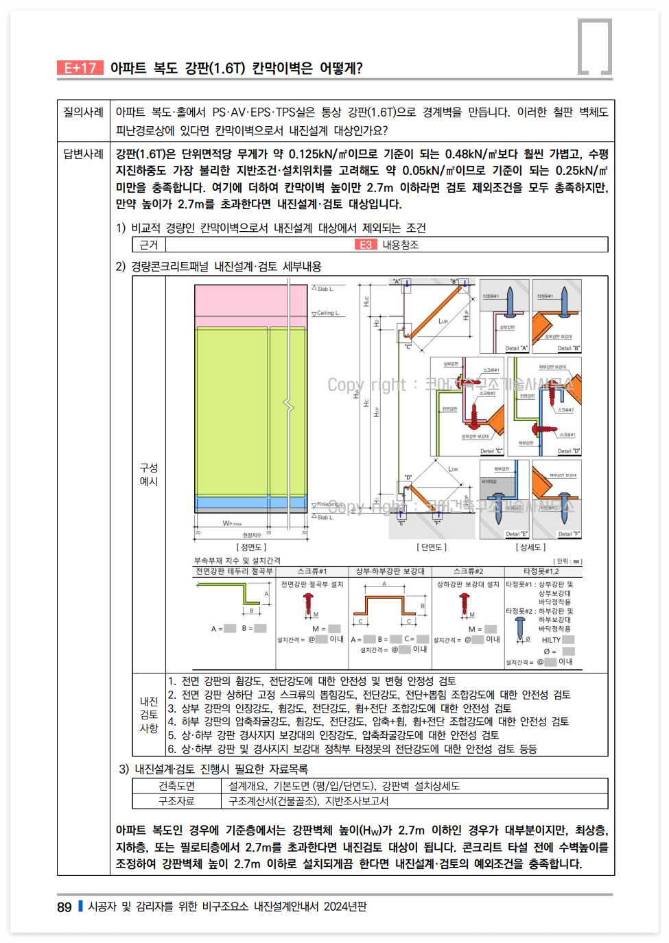 강판(1.6T)은 단위면적당 무게가 약 0.125kN/㎡이므로 기준이 되는 0.48kN/㎡보다 훨씬 가볍고, 수평지진하중도 가장 불리한 지반조건·설치위치를 고려해도 약 0.05kN/㎡이므로 기준이 되는 0.25kN/㎡ 미만을 충족합니다. 여기에 더하여 칸막이벽 높이만 2.7m 이하라면 검토 제외조건을 모두 총족하지만, 만약 높이가 2.7m를 초과한다면 내진설계·검토 대상입니다.