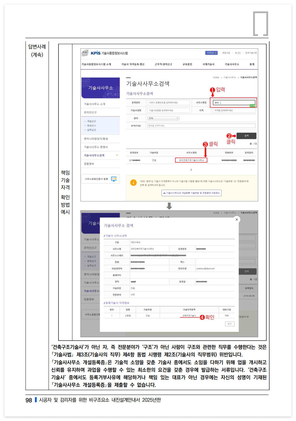 따라서 '국가기술자격증(기술사)' 또는 '기술사 등록 확인서' 만으로는 '기술사사무소' 개업 여부를 확인할 수 없는 것이며, 과학기술정보통신부장관, 즉 정부의 제도적 관리의 통제를 받는다고 볼 수 없는 것이므로 그 성과품에 담겨진 안전에 대한 검토 및 대책 등에 대한 신뢰가 완성되었다고 볼 수 없습니다. 즉 책임질 수 없는 자에게 책임을 기대하는 것이고, 그 책임의 소명은 다시 의뢰인에게 귀속된다고 볼 수 있습니다.