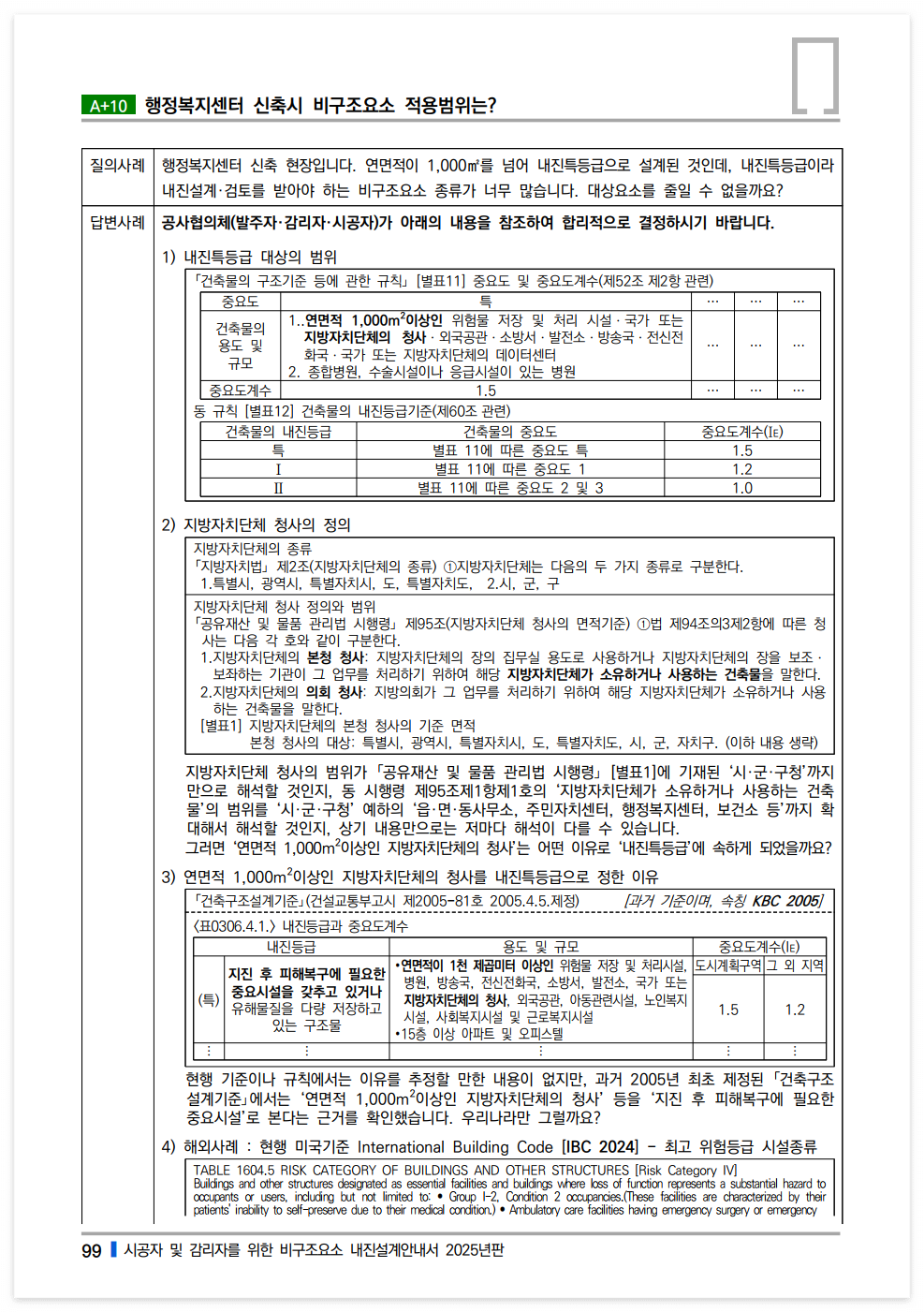 일례로 연면적 1,000m² 이상인 행정복지센터에 「재난안전상황실」이 없거나 「긴급대피수용시설」로 지정되지 않은 경우라면 비구조요소 검토대상의 범위에서 만큼은 내진특등급으로 적용하는 것은 합리적이지 못하다고 볼 수 있습니다. 반대 사례로, 만약에 시·군·구청의 재난안전상황실을 연면적 1,000m² 미만의 별동 건물로 증축한다면, 그 건축물은 기능목적상 내진특등급을 적용해야 하는 것이 타당한데, 단지 면적기준상 연면적 1,000m² 미만이므로 내진I등급으로 하겠다는 것도 이치에 맞지 않는 것입니다.